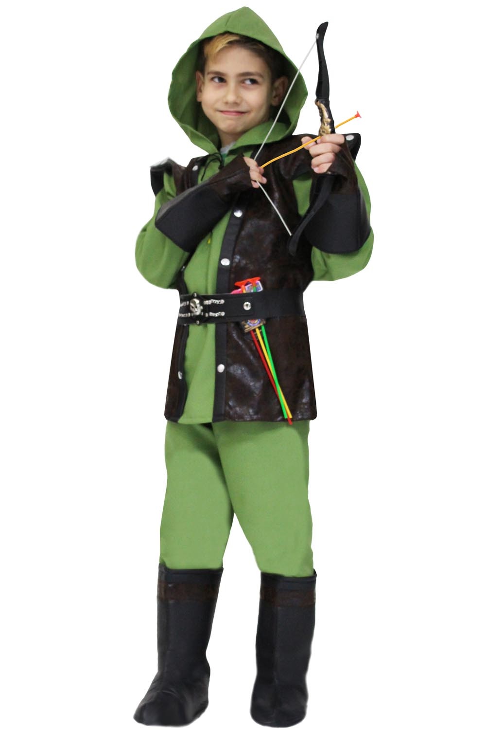 jacket with hood, belt, gloves, trousers, boot covers, bow and arrow
